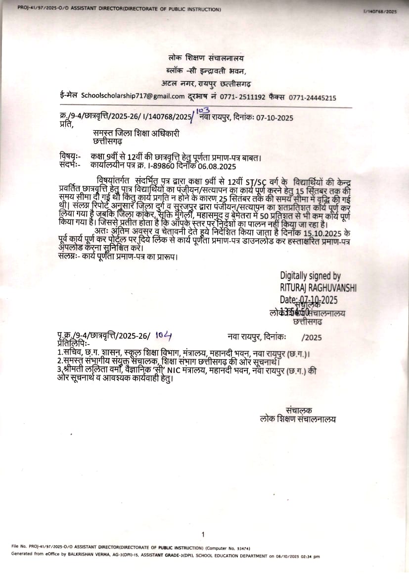 कक्षा 9वी-12वी की छात्रवृत्ति हेतु पूर्णता प्रमाण पत्र बाबत । (09-10-2025)