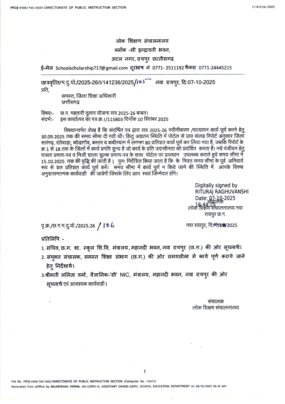 छ.ग. महतारी दुलार योजना के विद्यार्थियों की पात्रता की जांच विषयक्। (15-10-2025)